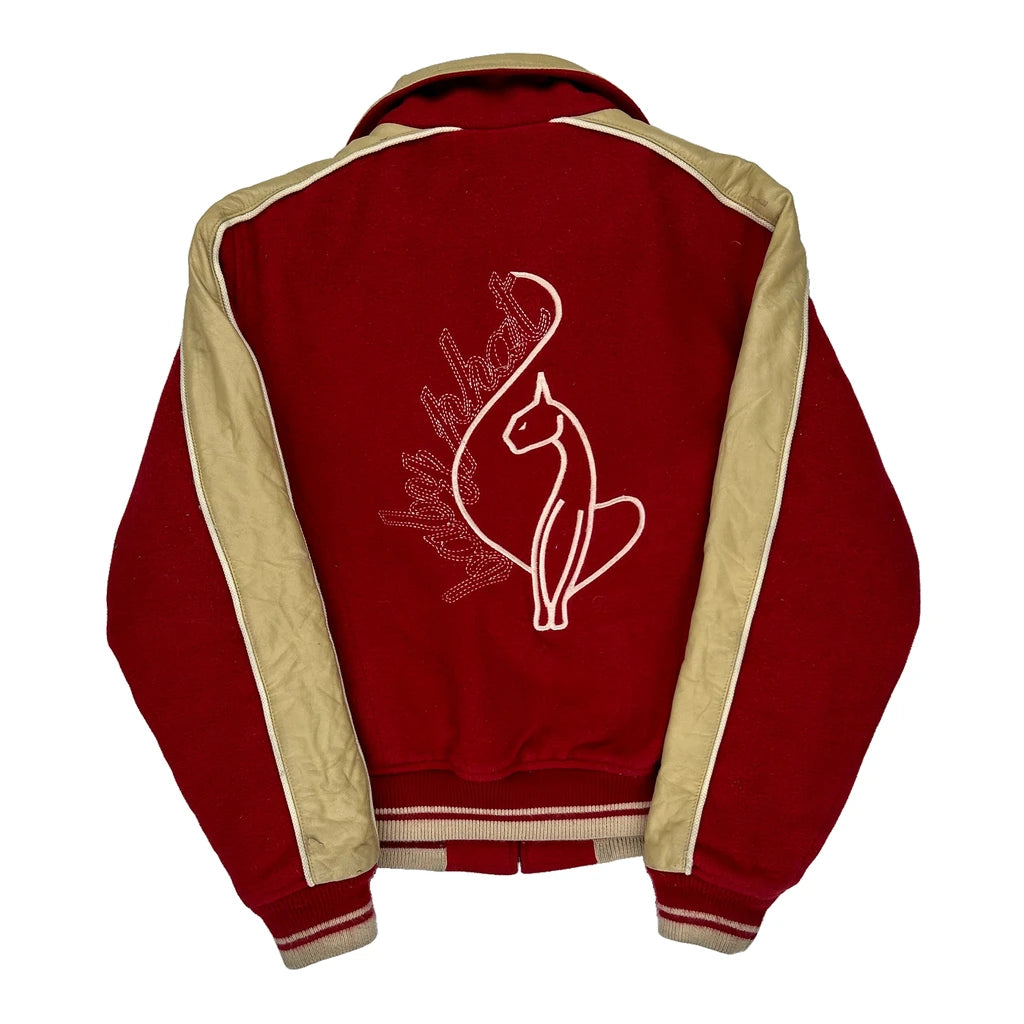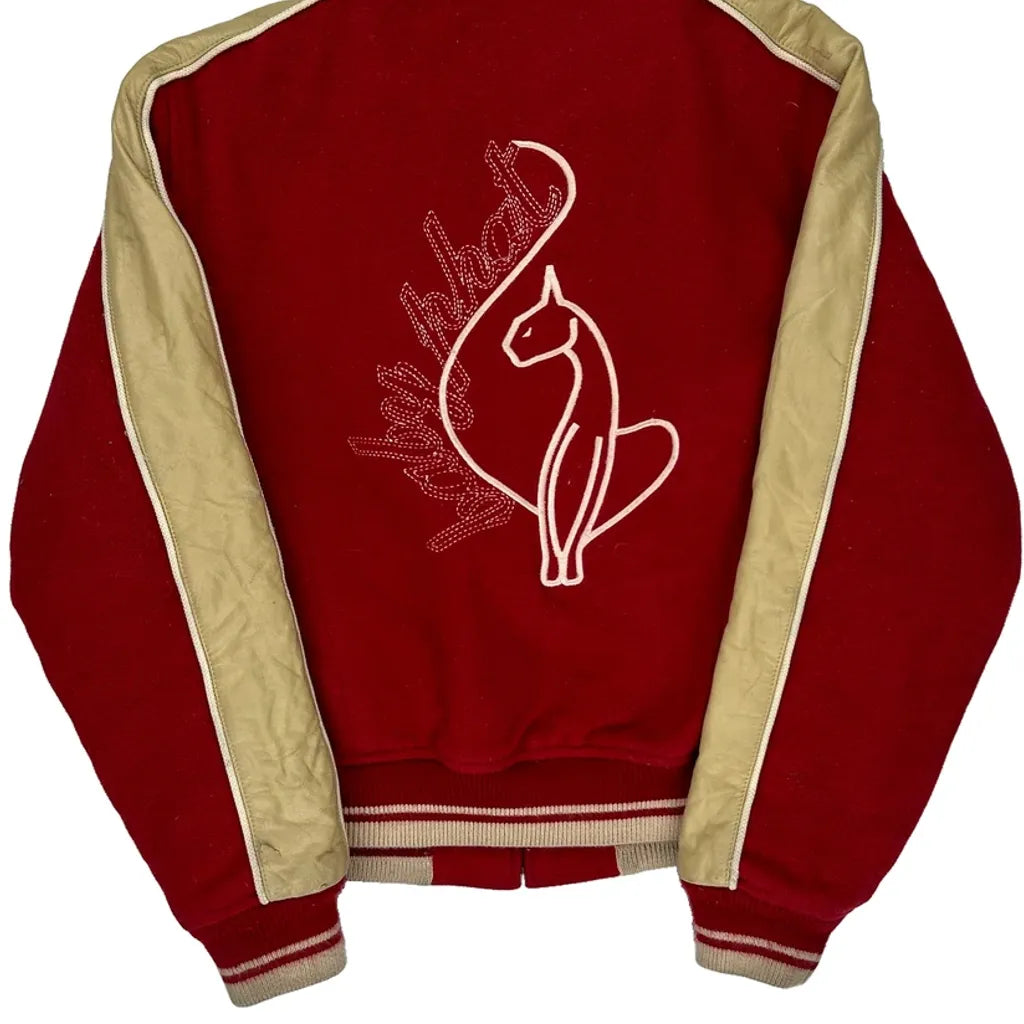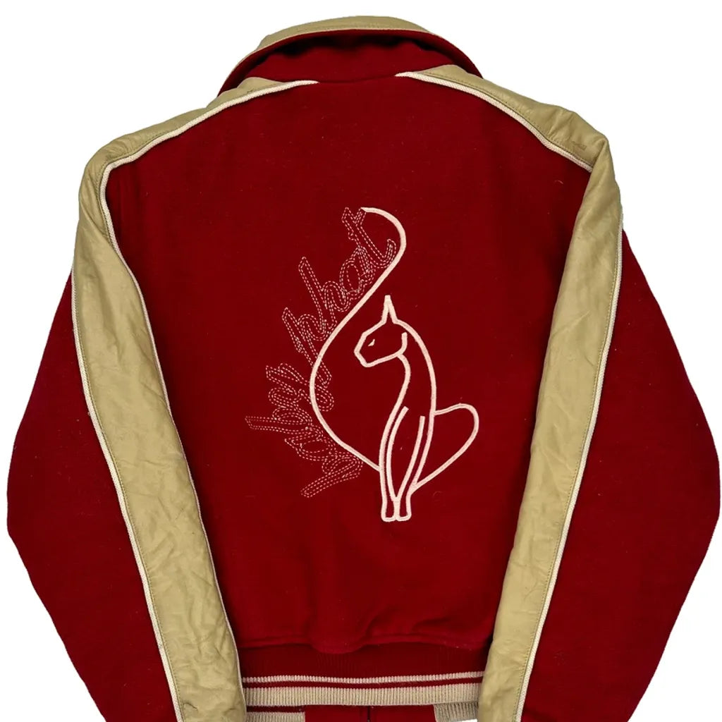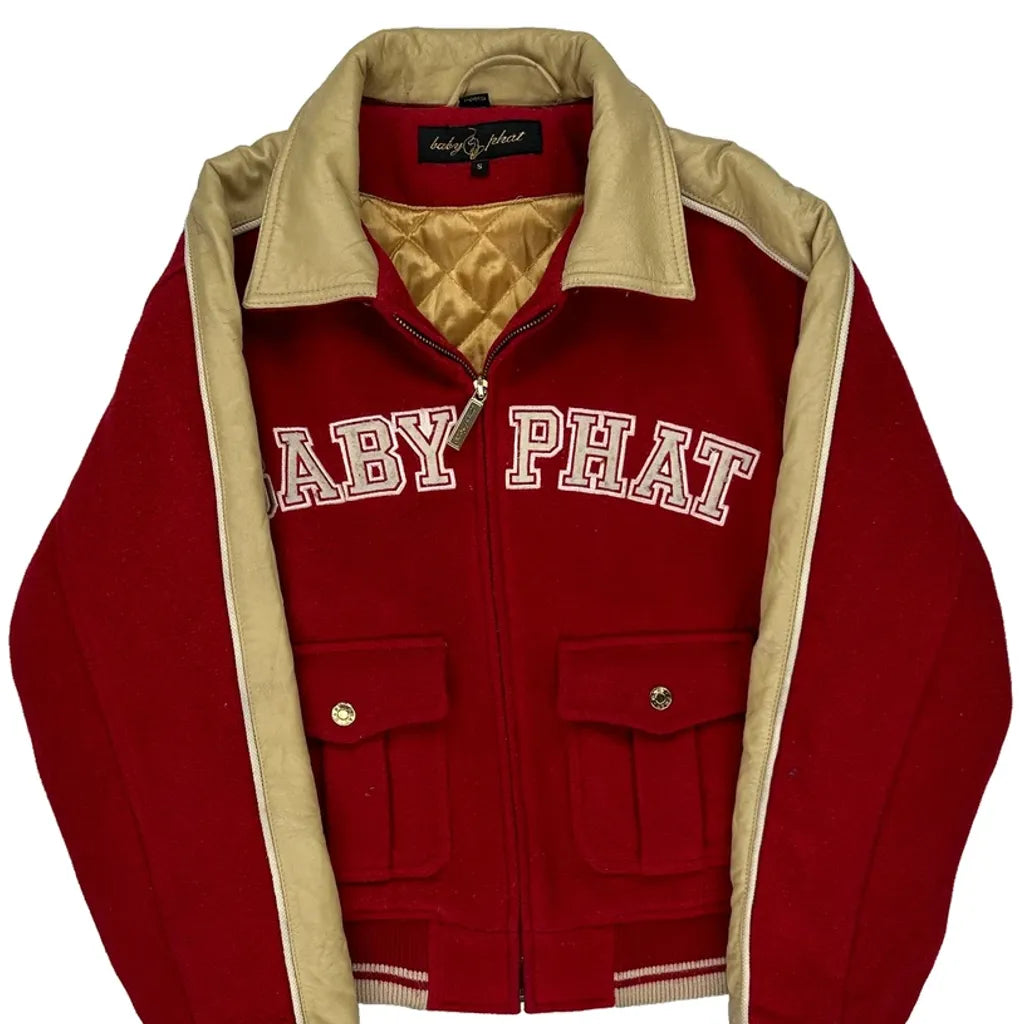 Baby Phat Red And Beige Varsity Jacket With Spellout Logo On Front And Embroidered Logo On Back.
