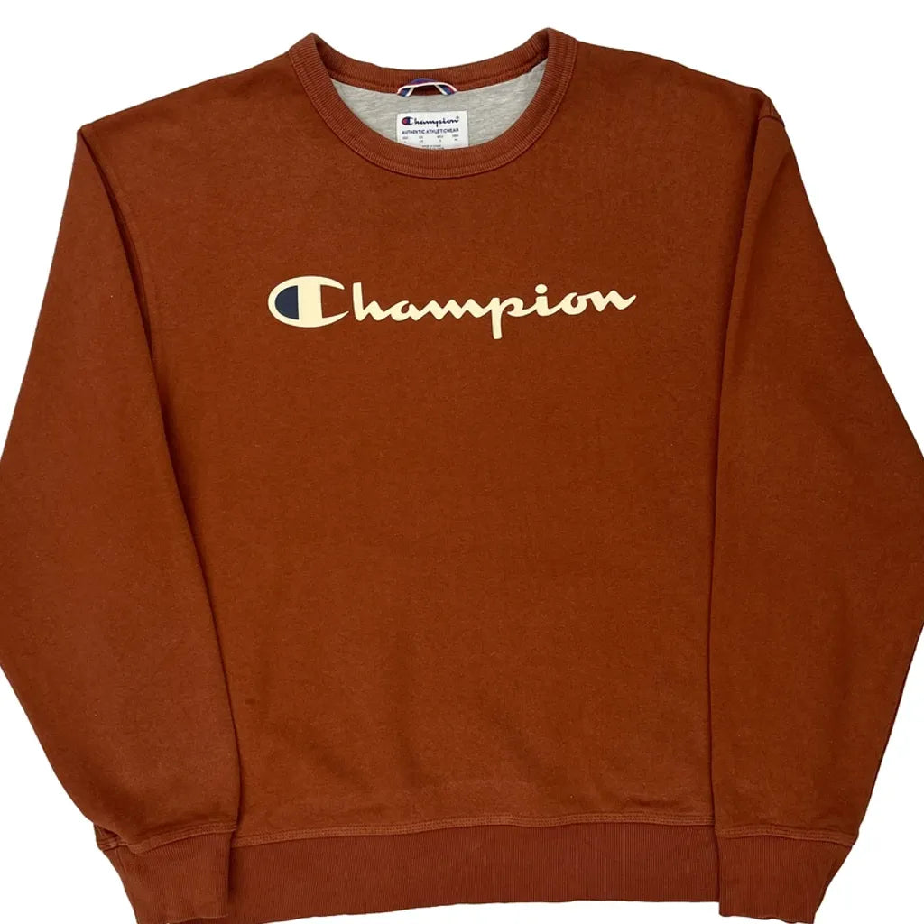 Champion Spellout Sweatshirt - Large Brown Cotton Blend