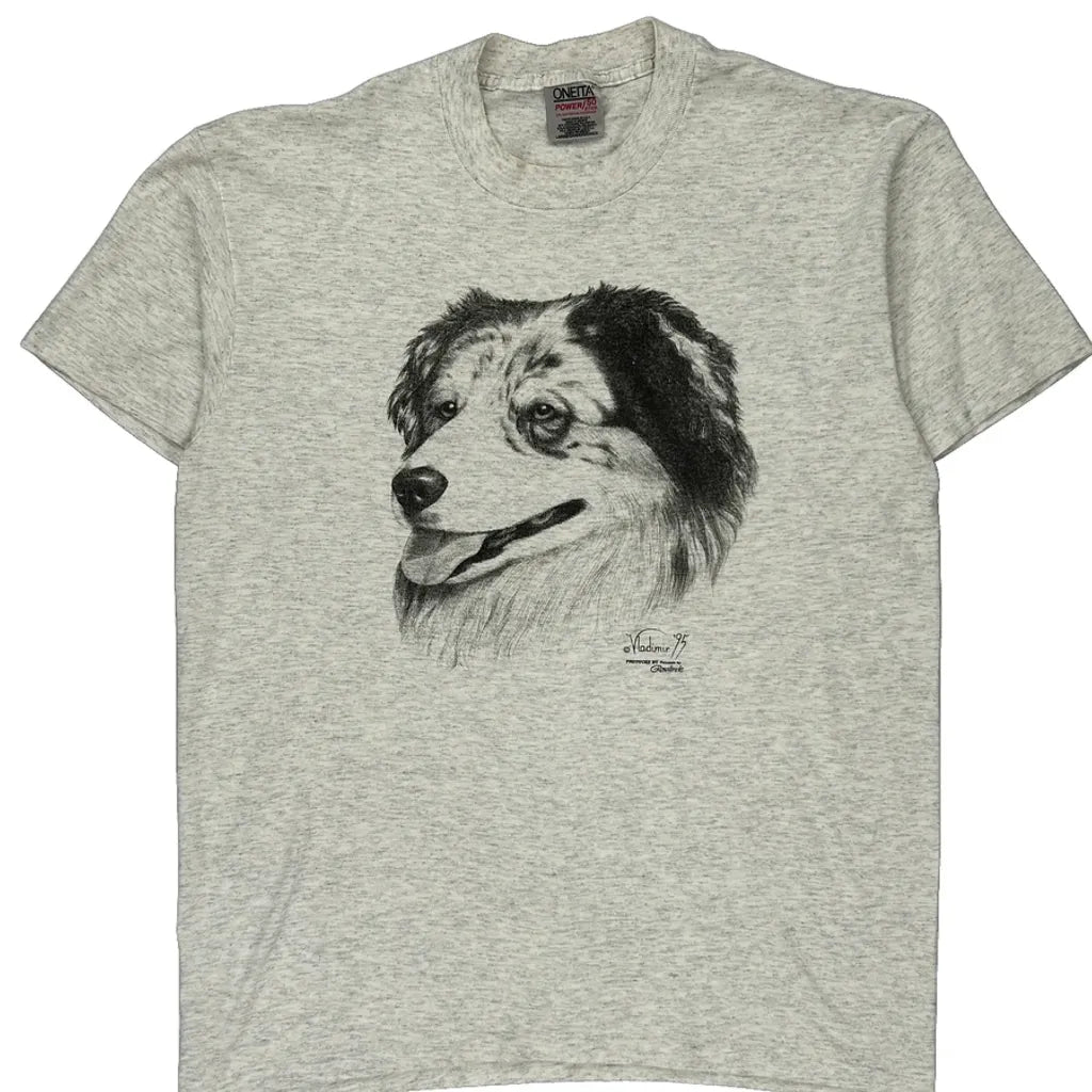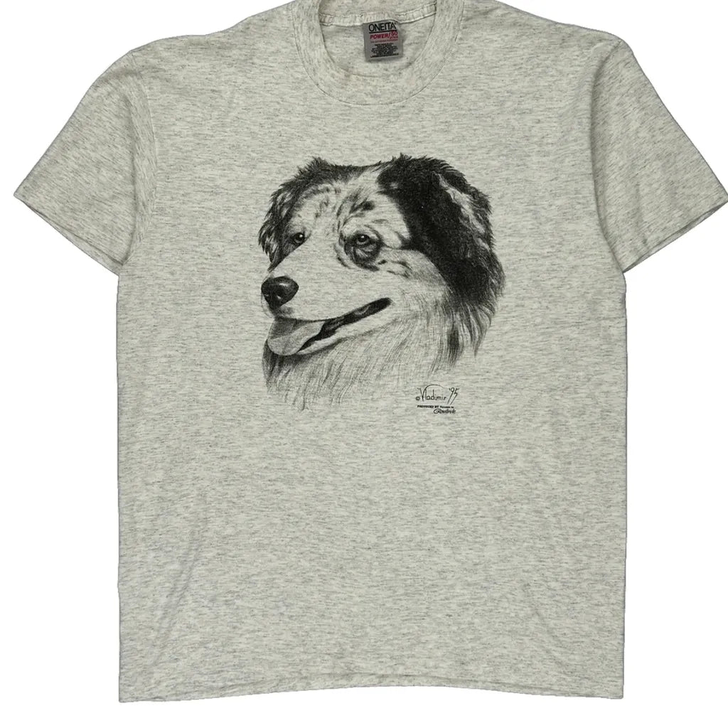 Dog Print Oneita Single Stitch T-Shirt - Large Grey Cotton Blend