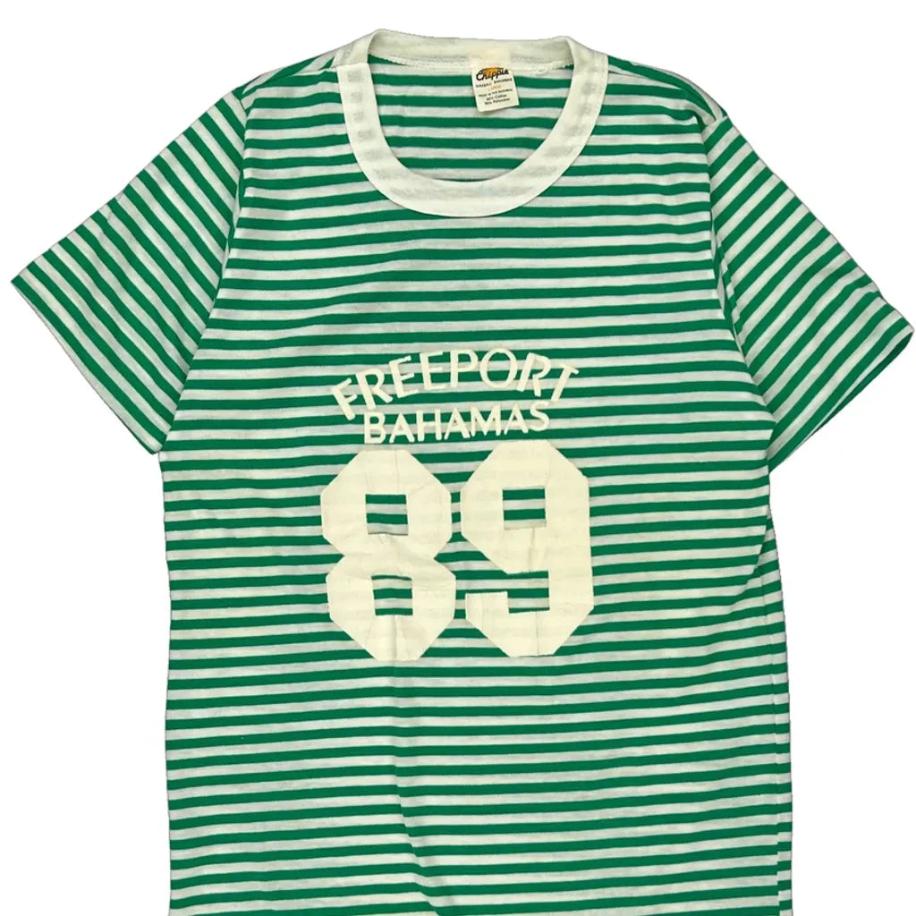 Green And White Striped T-Shirt With Freeport Bahamas 89 Print