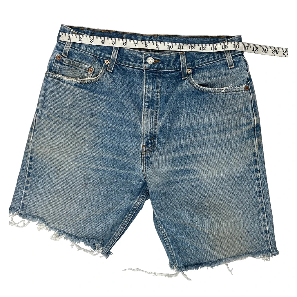 Levis Denim Shorts, fit a 32″ Waist and 9″ inseam.