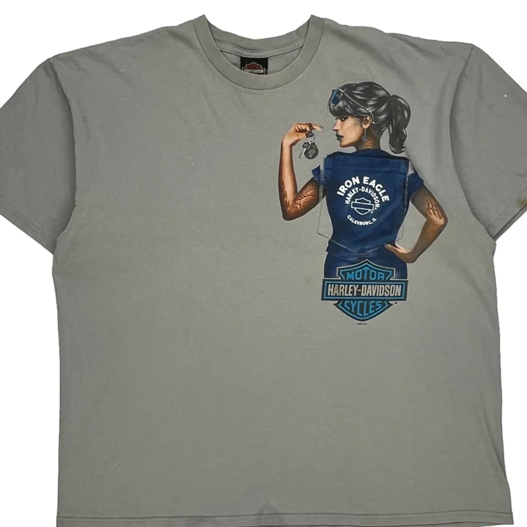 Harley Davidson Graphic T-Shirt With A Woman Holding Keys Illustration.