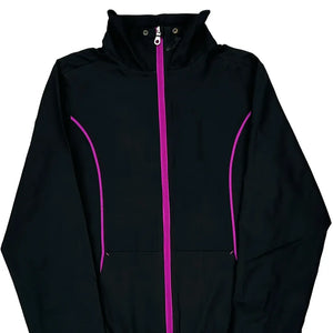 Black Windbreaker With Purple Zipper And Trim.