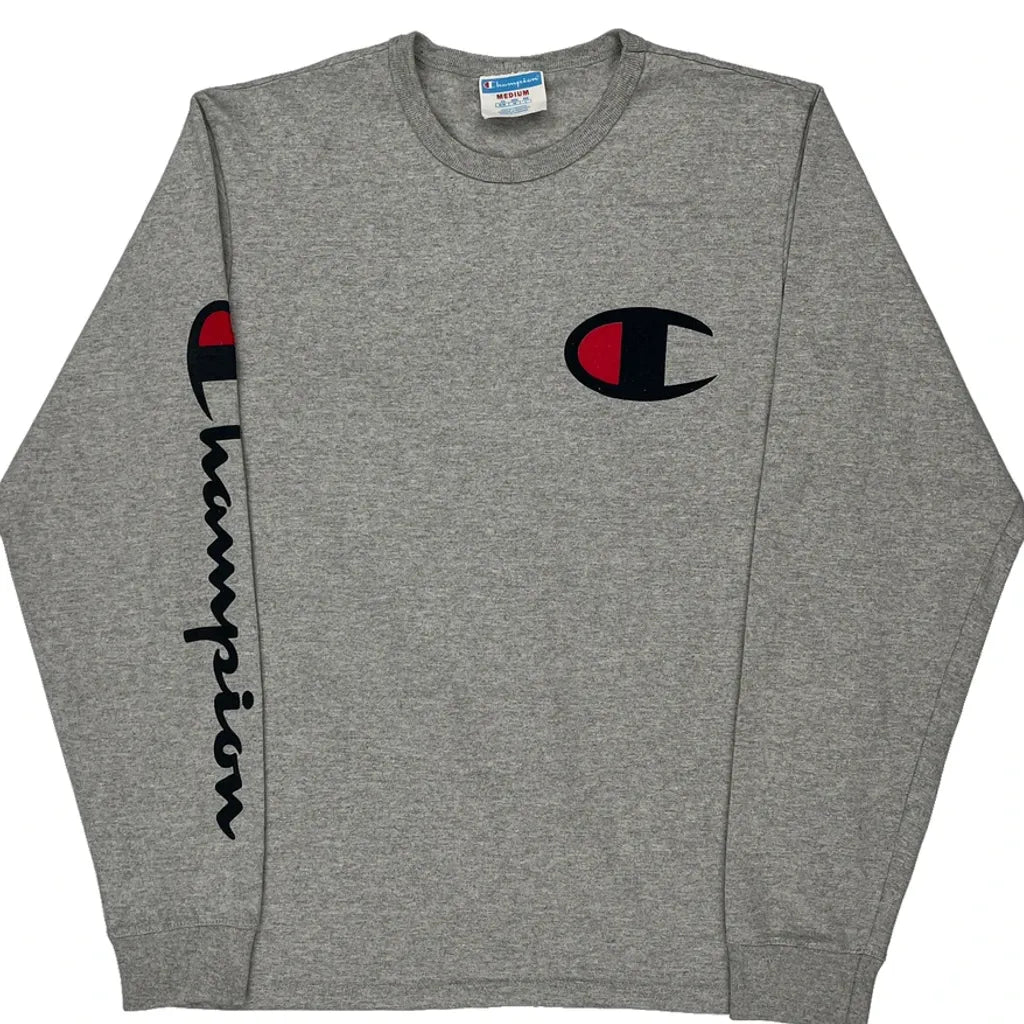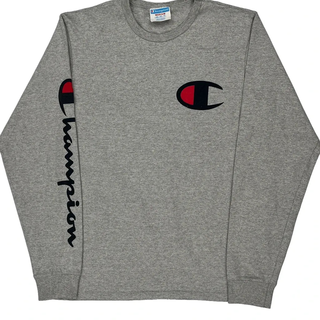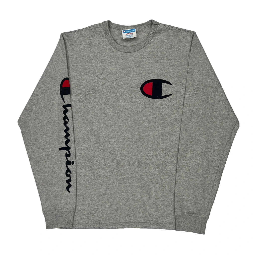 Reverse Weave Champion Spellout Long Sleeve T-Shirt - Medium Grey Cotton