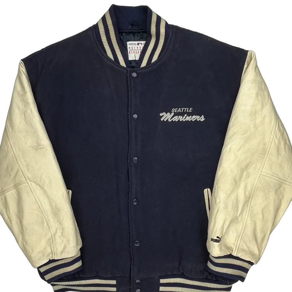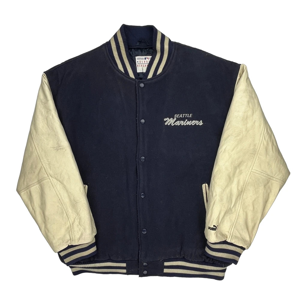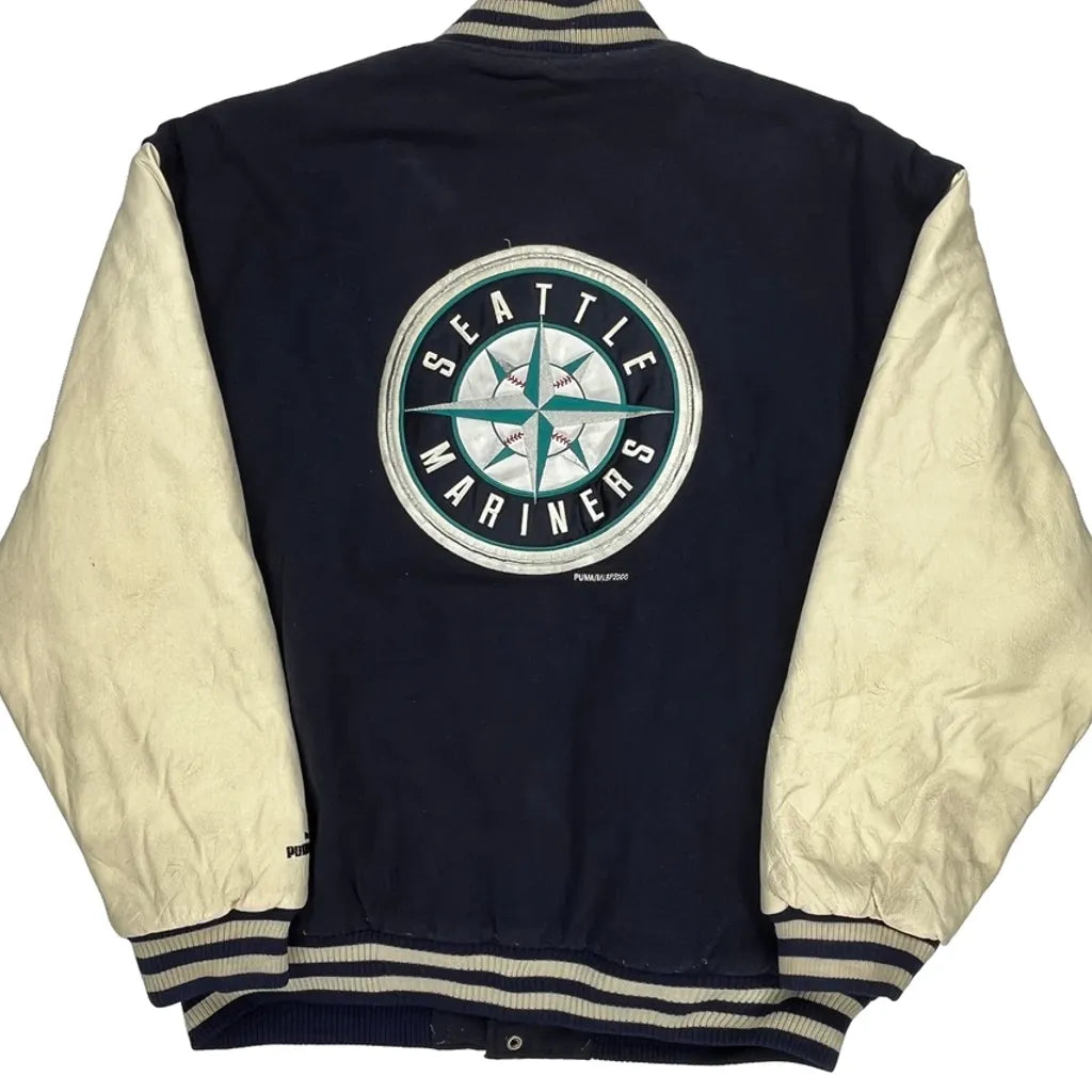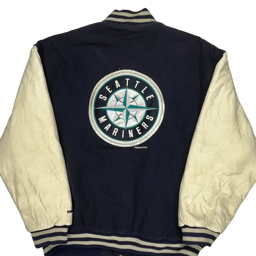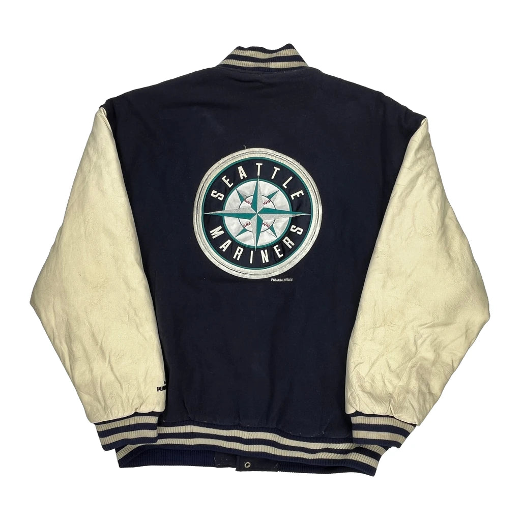 Seattle Mariners Puma Mlb Varsity Jacket - Large Cream Leather