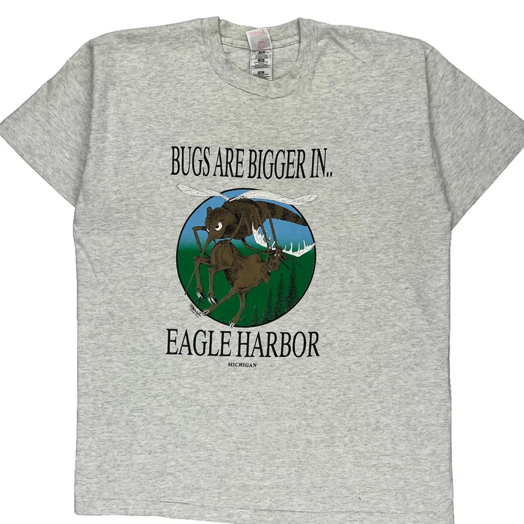 Single Stitch Eagle Harbor Fruit Of The Loom Graphic T-Shirt - XL Grey Cotton