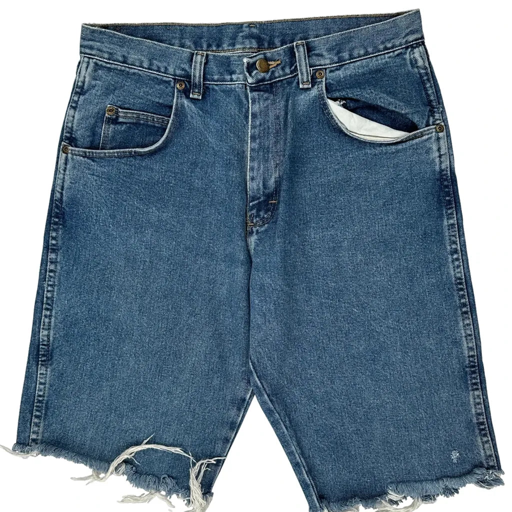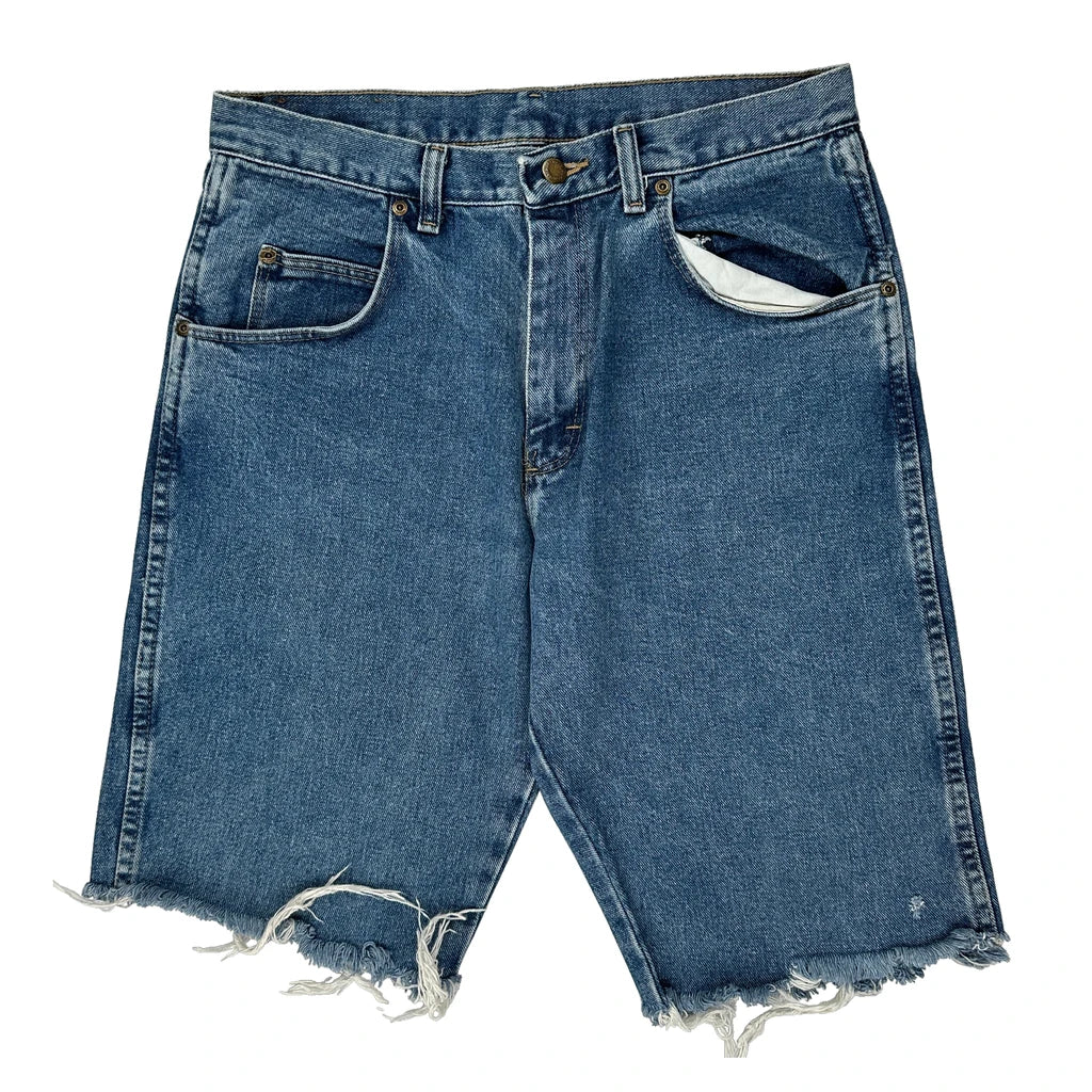 Wrangler Denim Shorts, fit a 32″ Waist and 10″ inseam.